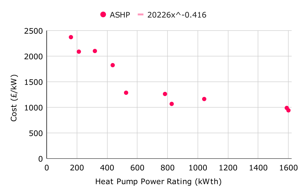 ASHPsy = 20,226 x-0.416 (where x is the costs in £/kW and y is the heat pump power rating in kWth).