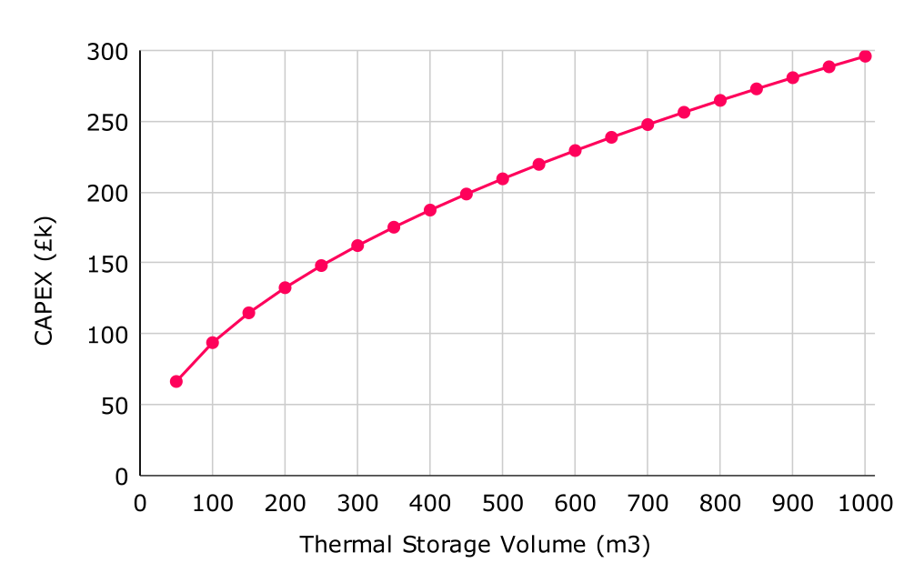 Capital costs of insulated hot water tanks for thermal storage are presented in Figure 2. These values are derived from a curve fit to data published by the Danish Energy Agency, converted from Euros to GBP and inflated from 2018 to 2024 prices based on CPIH.
